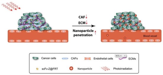Cancer-associated fibroblasts (CAFs) are widely present in the periphery of a variety of tumors, acting as a physical barrier and hindering the penetration of nanoparticles into tumor tissues. Removal of CAF may reduce the content of collagen in the extra-cellular matrix, thereby improving the aggregation and diffusion of nanoparticles. Fibroblast-activation protein (FAP) is a plasma surface protein that is widely up-regulated in CAF and has been considered a universal tumor target. Li et al. [] developed a single chain variable fragment (scFv) sequence targeting FAP conjugated and ZnF16Pc contained ferritin nanoparticles (αFAP-Z@FRT), selectively killing CAFs under the action of PDT and increasing the relative uptake rate of tumors by more than 5 times (Figure 9). Zhou et al. [] found on the basis of the above research that PDT can induce cellular immunity to cancer cells and also stimulate immunity against CAFs. In bilateral 4T1 tumor models, after αFAP-Z@FRT were injected into animals, the primary tumors were irradiated with laser, and the contralateral tumors were unirradiated. The tumor inhibition rate of primary tumors was 90.2% on the 23rd day. At the same time, the growth of the secondary tumors was also inhibited, resulting in a non-local effect. In adoptive cell transfer study, T cells extracted from 4T1 tumor-bearing animals after αFAP-Z@FRT PDT treatment could delay the growth of A549 tumors bored in nude mice lacking native T cells. The transferred T cells should not directly kill A459 cells. The results support that αFAP-Z@FRT PDT can stimulate immunity against CAFs and induce broad-spectrum anti-cancer immunity. In this case, given that CAF exists in almost all solid tumors, anti-CAF PDT may become a unique tumor vaccination method.