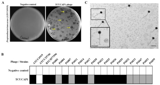 (A) Representative images showing spot tests of the isolated C. acnes phages TCUCAP1. Yellow arrows showed clear plaques with halos. (B) Host range analysis of TCUCAP1. TCUCAP1 was mixed with different bacterial strains. The extent of lysis was observed by eye and is indicated as follows: white cells, no lysis; grey cells, partial lysis (turbid plaque); and black cells, complete lysis (clear plaque). (C) Representative electron micrographs showing the morphology of TCUCAP1. The phage was classified as Siphoviridae due to their head and non-contractile tail. Scale bar, 100 nm.