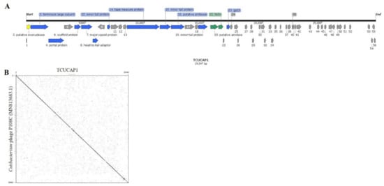 (A) Organization of the TCUCAP1 genome. ORFs coding for proteins involved in structure and assembly are marked in blue; ORFs coding for proteins involved in lysogeny are marked in yellow; ORFs coding for enzymes involved in host lysis are marked in green; ORFs coding for hypothetical proteins are marked in grey. Arrows indicate the direction of transcription and translation. The figure was generated using the SnapGene program, http://www.snapgene.com (accessed on 21 April 2021). (B) Dot plot nucleotide sequence comparisons of TCUCAP1 and phage P108C were compared using the dot plot program Gepard.