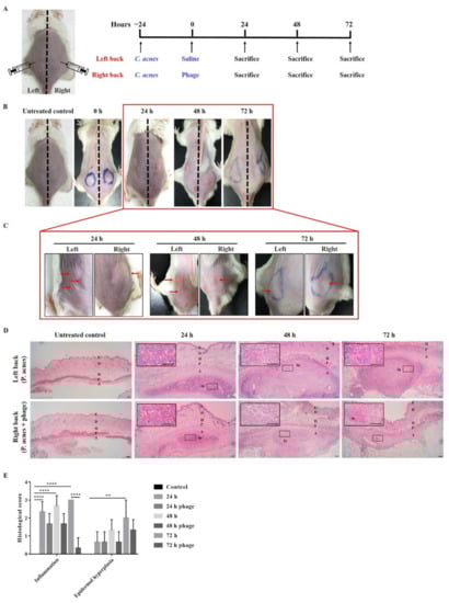 Mice were observed for the degree of pathological change at 24, 48, and 72 h after C. acnes injection (group A) or phage injection (group B). In addition, three mice were sacrificed and tissue samples were obtained by excisional biopsy at each time marker. Hematoxylin and eosin (H&E) staining was performed as previously described []. The slides were examined for inflammation and hyperplasia of the epidermal wall. The degree of pathological changes was classified in an arbitrary score: 0, absent; 1, mild; 2, moderate; and 3, pronounced [].