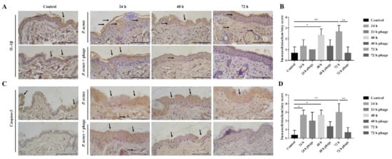 To investigate whether phage TCUCAP1 can also prevent C. acnes in vivo, 2 × 107 CFU C. acnes was injected into both sides of the mice’s backs as previously described []. Mice were then given phage therapy in one side of their backs with 2 × 107 PFU of phage and were sacrificed at 24, 48, and 72 h post-treatment (Figure 3A). The results showed that mice injected with C. acnes developed inflammatory nodules (Figure 3B,C; Figure S1). On the side of the back of the phage injection, most nodules decreased in size or disappeared, and no nodules increased in size. Similar results were observed in histology. As C. acnes injections induced severe inflammation and epidermal hyperplasia, phage therapy significantly reduced these pathological changes (Figure 3D,E). In addition, phage therapy significantly decreased the expression of inflammatory marker IL-1β (Figure 4A,B) and apoptotic marker caspase-3 (Figure 4C,D).