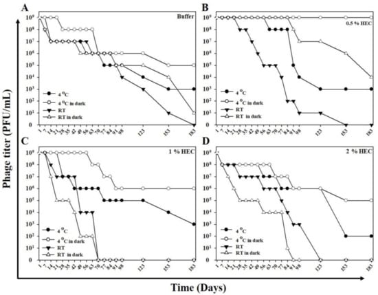 To investigate the stability of the cream, each concentration of the cream was stored at 4 °C and at room temperature (i.e., 20–25 °C) in light-transmitting or light-protected bottles. The stability of the cream to lyse the underlying bacteria was assessed at weekly intervals up to 180 days. Briefly, 0.01 g of HEC cream was removed at weekly intervals. The sample was completely mixed into the phage buffer (10 mM Tris, pH 7.5, 10 mM MgSO4, 68.5 mM NaCl, and 1mM CaCl2) to a volume of 100 μL. A 10-fold serial dilution was performed, and 10 μL of these dilutions was placed onto a lawn plate with C. acnes (1.8 × 108 CFU/mL). The titers of active phage were examined after anaerobic incubation at 37 °C for 48 h.