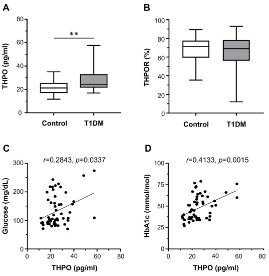 Circulating thrombopoietin (THPO) levels, measured by ELISA (A), and THPO receptor (R) expression, detected ex vivo by flow cytometry (B), in healthy controls (n = 28) and type 1 diabetes mellitus (T1DM) patients (n = 28). Data were represented as median (range). p-values by Mann–Whitney test ((A) ** p < 0.01; (B) not statistically significant). Correlation of THPO plasma levels with fasting plasma glucose (C) and HbA1c (D). Analyses by Spearman correlation tests; correlation coefficient r- and p-values are shown.