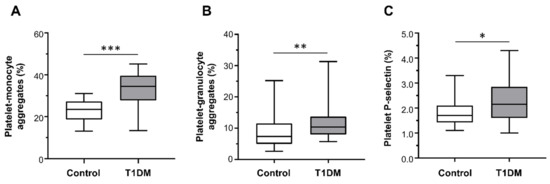 Platelet–monocyte aggregates (A), platelet–granulocyte aggregates (B), and platelet P-selectin expression (C) detected ex vivo, by flow cytometry, in healthy controls (n = 28) and type 1 diabetes mellitus (T1DM) patients (n = 28). Data were represented as median (range). p-values by Mann–Whitney test ((A) *** p < 0.001, (B) ** p < 0.01, and (C) * p < 0.05).