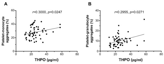 THPO plasma levels significantly correlated with ex vivo platelet–monocyte aggregation (r = 0.3000, p = 0.0247; Figure 3A) and platelet–granulocyte binding (r = 0.2955, p = 0.0271; Figure 3B), but not with platelet P-selectin expression (r = 0.2411, p = 0.0735; not shown).