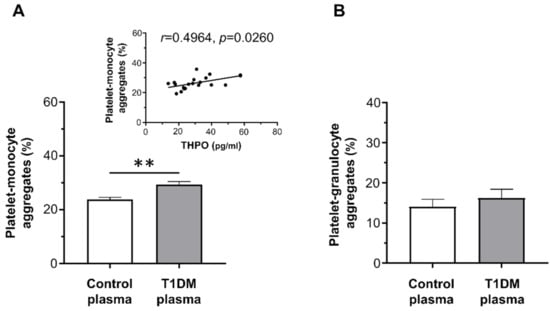 THPO levels measured in vivo significantly correlated with the priming activity exerted in vitro by plasma samples from diabetic patients on platelet–monocyte aggregation (r = 0.4964, p = 0.0260; Figure 4A-insert).