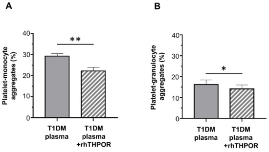 The contribution of THPO to this effect was assessed by inhibiting its biological activity using a recombinant human (rh)THPOR. Pre-treatment of plasma from T1DM patients with the rhTHPOR reduced the priming effect exerted by plasma from type 1 diabetic patients both on platelet–monocyte (mean ± SE: 22.24% ± 1.71% vs. 29.32% ± 1.11%; Figure 5A) and platelet–granulocyte binding (mean ± SE: 14.16% ± 1.85% vs. 16.22% ± 2.21%; Figure 5B). On the contrary, neither pre-incubation of plasma from healthy subjects with rhTHPOR nor rhTHPOR alone had a significant effect on platelet–leukocyte adhesion (data not shown).