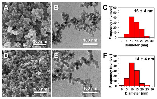 (A,D) Scanning electron microscopy (SEM), (B,E) transmission electron microscopy (TEM), and (C,F) size distribution of (A–C) precipitated SiO2 and (D–F) fumed SiO2. Size distributions were obtained by randomly selecting at least 100 particles from the TEM images.