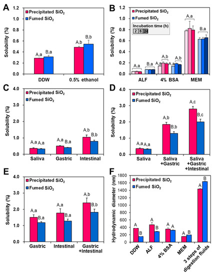 Dissolution properties of precipitated SiO2 and fumed SiO2 in (A) distilled and deionized water (DDW) and 0.5% ethanol; (B) artificial lysosomal fluid (ALF), 4% bovine serum albumin (BSA) solution, and minimum essential medium (MEM); (C,D) in vitro digestion fluids; and (E) ex vivo rat-extracted gastrointestinal (GI) fluids. (F) Hydrodynamic diameters of precipitated SiO2 and fumed SiO2 in DDW, ALF, 4% BSA solution, MEM, and three consecutive steps of in vitro digestion fluids. Different uppercase letters (A,B) indicate significant differences between precipitated SiO2 and fumed SiO2 under the same conditions (p < 0.05). Different lowercase letters (a,b,c) indicate significant differences between experimental conditions (p < 0.05).