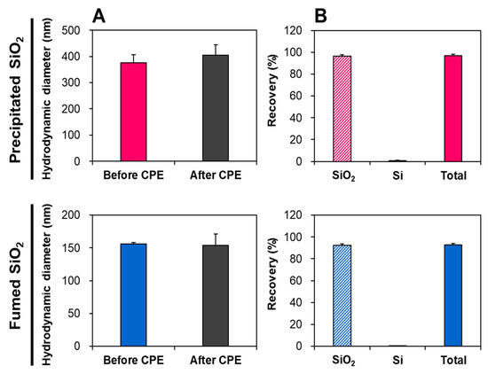(A) Hydrodynamic diameters of food additive SiO2 before and after cloud point extraction (CPE). (B) Recoveries (%) of SiO2 particles, Si ions, and total Si levels, obtained via CPE. No significant differences between before and after CPE were found (p > 0.05).
