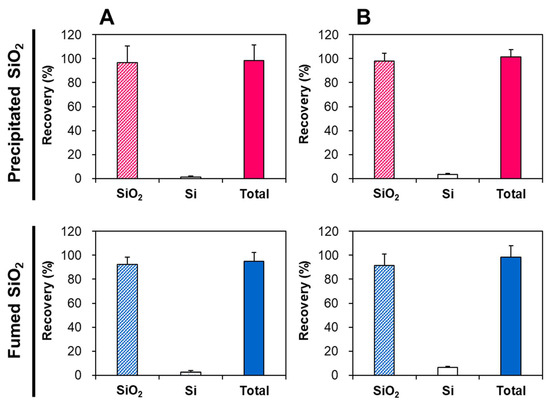 Recoveries (%) of SiO2 particles, Si ions, and total Si levels in (A) SiO2-spiked Caco-2 cells and (B) SiO2-spiked liver, obtained via cloud point extraction (CPE).