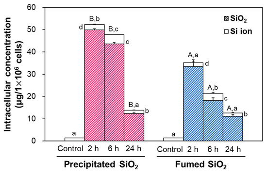 Intracellular uptakes and fates of SiO2 in Caco-2 cells, obtained via cloud point extraction (CPE). Different uppercase letters (A,B) indicate significant differences in total intracellular Si levels between precipitated SiO2 and fumed SiO2 (p < 0.05). Different lowercase letters (a,b,c,d) indicate significant differences between different incubation times (p < 0.05).