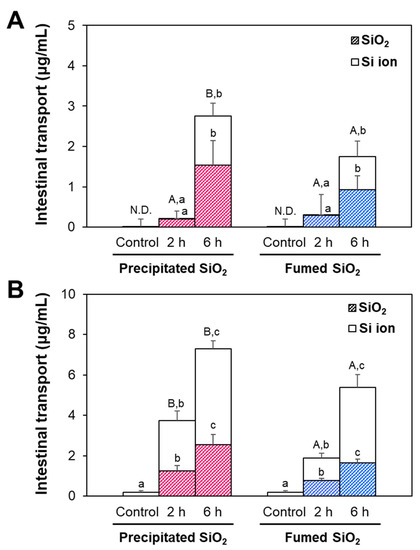 Intestinal transports and fates of SiO2 using (A) in vitro Caco-2 monolayer and (B) follicle-associated epithelium (FAE) models, obtained via cloud point extraction (CPE). Different uppercase letters (A,B) indicate significant differences in total Si transport levels between precipitated SiO2 and fumed SiO2 (p < 0.05). Different lowercase letters (a,b,c) indicate significant differences between different incubation times (p < 0.05). ND: not detectable.