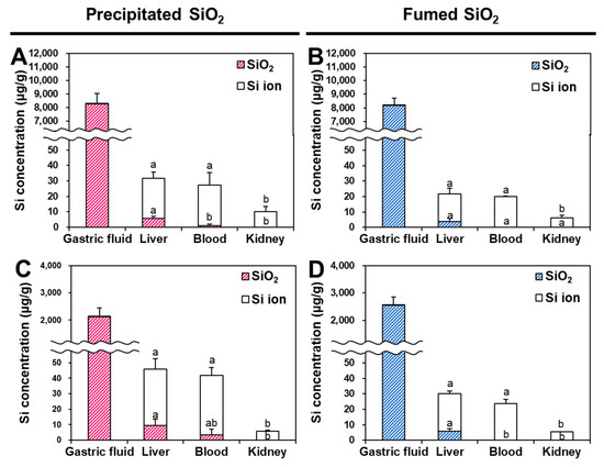 Tissue distribution and fates of (A,C) precipitated SiO2 and (B,D) fumed SiO2 in rats after single-dose oral administration of (A,B) 300 mg/kg or (C,D) 2000 mg/kg, obtained via cloud point extraction (CPE). Different lowercase letters (a,b) indicate significant differences between tissues (liver, blood, and kidney) (p < 0.05).