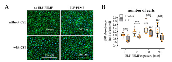 SCP-1 cell viability is affected by 16 Hz ELF-PEMFs (0, 7, 30, and 90 min) and 5% cigarette smoke extract (CSE). (A) Fluorescent Calcein-AM staining (2 µM, green) was used to visualize living cells, and Hoechst 33,342 (2 μg/mL, blue) was used as nuclear counterstain. (B) Sulforhodamine B (SRB) staining was used to quantify cell numbers by total protein content after 3 days. N = 3, n = 3. Data are presented as a box plot (Min to Max with single data points). Data were compared by non-parametric two-way ANOVA followed by Tukey’s multiple comparison test: *** p < 0.001 as indicated; # p < 0.05 ### p < 0.001 as compared to the respective control (no ELF-PEMF).