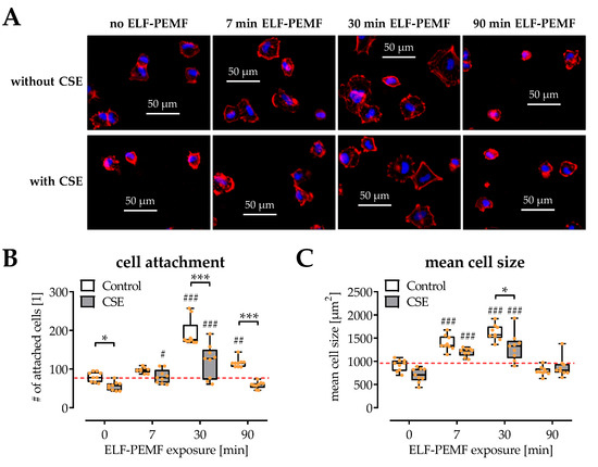 Influences of 16 Hz ELF-PEMFs (0, 7, 30, and 90 min) and 5% cigarette smoke extract (CSE) on SCP-1 cell adhesion and spreading after 4 h. (A) Representative images (400× magnification) of the fluorescence staining for cytoskeleton (phalloidin-TRITC, 2 μg/mL, red) and nuclei (Hoechst 33342, 2 μg/mL, blue). (B) Automated quantification of adherent nuclei, and (C) the mean size of attached SCP-1 cells using the ImageJ software. N = 3, n = 3. Data are presented as box plots (Min to Max with single data points). Data were compared by non-parametric two-way ANOVA followed by Tukey’s multiple comparison test: * p < 0.05 and *** p < 0.001 as indicated; # p < 0.05, ## p < 0.01, and ### p < 0.001 as compared to the respective control (no ELF-PEMF).