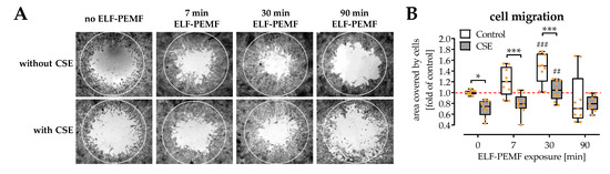 Migration of SCP-1 cells is affected by 16 Hz ELF-PEMFs (0, 7, 30, and 90 min) and 5% cigarette smoke extract (CSE). (A) Sulforhodamine B (SRB) staining was performed to better visualize cells invading into the migration zone (dotted circle) after 72 h. (B) SCP-1 cell migration was quantified using the ImageJ software. N = 4, n = 2. Data are presented as a box plot (Min to Max with single data points). Data were compared by non-parametric two-way ANOVA followed by Tukey’s multiple comparison test: * p < 0.05 and *** p < 0.001 as indicated; ## p < 0.01 and ### p < 0.001 as compared to the respective control (no ELF-PEMF).