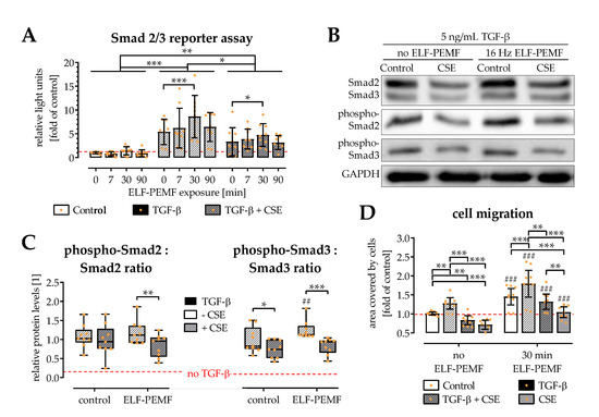 Canonical (Smad2/3) TGF-β signaling affected by 5% cigarette smoke extract (CSE) is fortified by exposure to the 16 Hz ELF-PEMFs. (A) An adenoviral reporter assay was used to quantify canonical (Smad2/3) TGF-β signaling in SCP-1 cells exposed to 5 ng/mL TGF-β, 5% CSE, and/or the 16 Hz ELF-PEMFs (0, 7, 30, 90 min daily exposure) for 72 h. Western blot was used to confirm phosphorylation of Smad2 and Smad3 in the cells with 30 min daily exposure to the 16 Hz ELF-PEMF. (B) Representative image of the Western blot. (C) Signal intensities were quantified with the ImageJ software and the ratio of phosphorylated-Smad2 to Smad2 and phosphorylated-Smad3 to Smad3 were determined. (D) SCP-1 cell migration was determined using the cell migration assay kit. Cells invading the migration zone were quantified using the ImageJ software. N = 3, n = 3. Data are presented as box plots (Min to Max with single data points). Data were compared by non-parametric two-way ANOVA followed by Tukey’s multiple comparison test: * p < 0.05, ** p < 0.01, and *** p < 0.001 as indicated; ## p < 0.01 and ### p < 0.001 marking the ELF-PEMF effect.