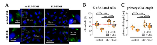 The structural integrity of primary cilia is affected by exposure to 5% cigarette smoke extract (CSE) and rescued by exposure to 16 Hz ELF-PEMFs for 5 days and 30 min daily. (A) Primary cilia were visualized by immunofluorescence staining for acetylated tubulin (green). Nuclei were counterstained with Hoechst 33,342 (blue). Fluorescent images were analyzed with the ImageJ software, to determined (B) the amount of ciliated cells in percent and (C) the length of the primary cilia. N = 3, n = 3. Data are presented as box plots (Min to Max with single data points). Data were compared by non-parametric two-way ANOVA followed by Tukey’s multiple comparison test: *** p < 0.001 as indicated.