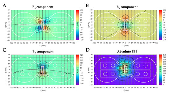 The AC magnetic field distribution of the applicator coil for all 3 directions and the absolute field approximately 4 mm above the coil. Heat maps summarize the distribution of the magnetic flux density: (A) Bx component, (B) By component, (C) Bz component, and (D) absolute |B|. The measurement was taken with the recalibrated 3 axes PNI RM3100 sensor for a constant current (I = 0.1 A) after subtracting the local earth magnetic field (I = 0 A).