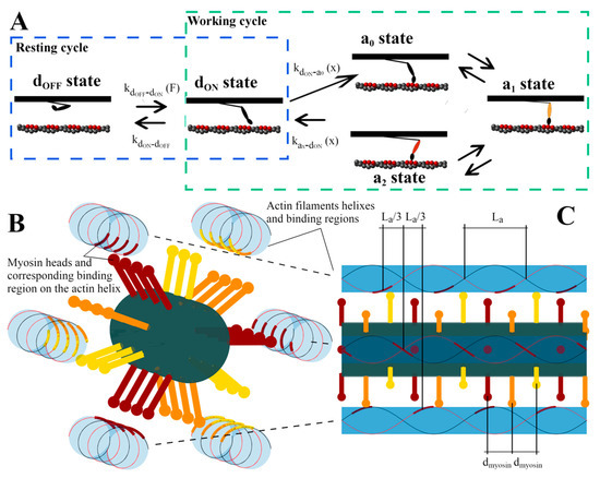 where is zero for i from 1 to 3, one for i from 4 to 6, and so on. Along each half thick filament, after a bare zone of LB = 50 nm from the M-line, a total of NXB = 147 myosin dimers are distributed in this way [9]. In each crown, the three myosin dimers are rotated by 120°, and around each thick filament there are six thin filaments which run parallel to the thick filament—one every 60° (Figure 1B). Through our Monte Carlo approach, we can use the actin filament periodicity to mimic the shift of the binding regions for every myosin motor due to the 3D structure (Figure 1B,C, same colors refer to binding regions for the corresponding motors). Actin filaments have a periodicity La of about 36 nm, and because of their double-stranded structure, the apparent periodicity is La every 180°, or La/3 every 60° (Figure 1C). Imposing that the two heads in the first dimer of the first crown () point precisely to one actin monomer of the corresponding thin filament (Figure 1B, deep red heads), then the other two dimers in the same crown point precisely to an(other) actin filament but rotated relatively to the first thin filament by 120° each. This can be simulated with a target region (deep red regions on actin filaments in Figure 1B,C) shifted by 2/3 La and 4/3 La with respect to the first actin filament for the second and third dimers in the first crown, respectively.