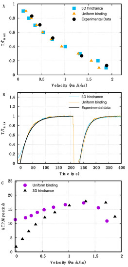 In the mean-field models, the geometrical hindrance can be introduced limiting the attachment rate to some intervals along the actin filament. The myosin motors are assumed to bind to the actin filament through a probability which is non-zero only in intervals smaller than the actin filament periodicity La. We use the same approach here (Equation (2)) and modulate the geometrical hindrance modifying . However, to reproduce the myosin motors spacing in the mean-field models is more complicated and the motors are usually uniformly distributed. Here, we used a Monte Carlo approach, which is more suitable to study the effects of the geometry, since it analyzes the behavior of each motor independently, allowing their precise spatial distribution. In this work, we use this method and introduce a pseudo-replication of the 3D-geometry to mimic the actomyosin spatial mismatch (Figure 1B). Few models based on this technique include an analysis of or analyze other above-mentioned incongruences. For instance, Smith and Mijailovich obtained a good fitting of but by accepting a fast rate of force generation during activation (7 ms of the half-rise time) [28].