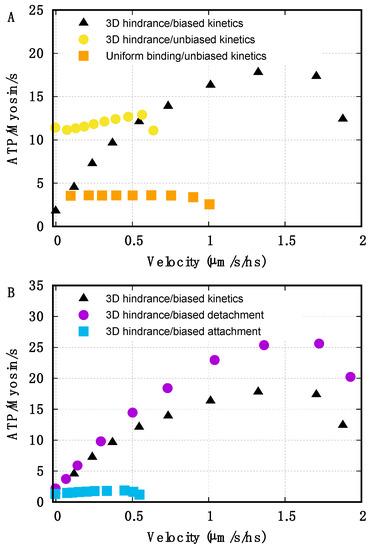 2.2. Preferential Detachment Has a Synergistic Effect with Geometrical Hindrance to Increase the Dependence of ATP-ase Activity on the Velocity of Shortening