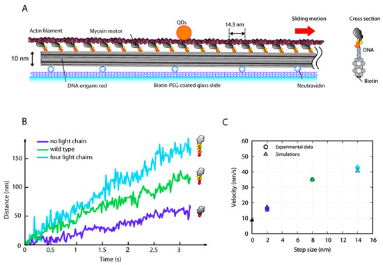 We tested the model predictions directly by observing the in vitro effect of biased kinetics when the acto-myosin spacing is preserved. To achieve our goal, we used the DNA-origami technique [24,35], a nanotechnology suitable to construct arbitrary three-dimensional nanostructures from DNA. Ten DNA duplexes were bundled in parallel [24] to build a rod nanostructure (DNA rod) to which we attached myosin motors with precise spacing of 14.3 nm (Figure 4A). The monomeric DNA rod (~250 nm in length) can attach 18 myosin motors with the same orientation, and the rod was oligomerized to form an ~1 µm-long filament structure (tetramer or pentamer). To observe actin sliding motion along our DNA rod-myosin complex, we first attached the complex onto a coverslip and then introduced actin filaments with ATP. We simultaneously observed the fluorescently labelled (TAMRA) DNA rod and actin filament (ATTO647N) (Supplementary Movie S1) and confirmed the actin filaments sliding over a DNA rod are longer than the DNA rod itself, suggesting that the number of interacting myosin heads was constant. Then, to precisely determine the actin sliding velocity, we attached fluorescent quantum dots (QDs) to the filaments and tracked the fluorescent spots with a few nanometer accuracy [36] using total internal reflection fluorescence microscopy (TIRFM). The actin filament constantly moved in one direction, and the velocity depended on the myosin constructs (Figure 4B).