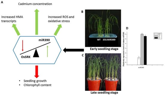 Ding et al. [49] employed a transgenic approach to investigate miRNAs role in the O. sativa response to Cd stress. O. sativa was transformed with a MiR390 overexpression plasmid, followed by validation of transgenic plants by analyzing their transcript levels of mature MiR390 and OsSRK. [49]. Transgenic plants exhibited a significant increase in miR390 transcripts (Figure 1), confirming overexpression and the OsSRK transcripts were much lower than the controls. Ding et al. [49] recorded an increase in OsHMA2, known to transport Zn/Cd from the roots to shoots, and OsNRAMP5, known to transport Mn and Cd into the roots in the transgenic plants under Cd stress [53,54]. The study recorded that in the presence of Cd the transgenic lines accumulated more Cd, which resulted in Cd toxicity. The conclusion was that these transcripts (OsHMA2 and OsNRAMP5) were positively regulated by miR390, indicating their importance in Cd accumulation and translocation in O. sativa plants. The seedling growth of transgenic lines was retarded, the chlorophyll content decreased, and MDA and H2O2 increased by 40% and 2-folds, respectively, when compared to the control plants [49]. The outcomes of the study by Ding et al. [49] correlated with a study conducted by Marin et al. [55] which concluded that in response to Cd stress, miR390 exerted a negative effect on the lateral root formation of A. thaliana plants (regulated the pathway involved in auxin signaling and lateral root development). Considering all of the results obtained, it can be concluded that miR390 acts as a negative regulator involved in Cd tolerance in O. sativa plants and that the expression of miR390 alters the expression pattern of several metal transporter genes, resulting in Cd accumulation and toxicity in O. sativa plants.