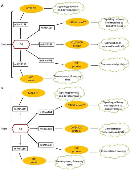 Represents the miRNA expression profiles in T. aestivum plants under CD stress. (A) Represents the 5 miRNAs that were downregulated in the leaves at 12 h after exposure to Cd stress. The miRNA159 (targets MYB3 transcription factor), miRNA164 (targets NAC domain Transcription factor), miRNA398 (targets CSD) and miRNA408 (targets CLP). Besides the other 4 miRNAs, miR156 remained downregulated at all time points within the study. (B) Represents the 5 miRNAs that were upregulated in the roots from 12 h until 24 h after exposure. miRNA408 remained upregulated at all time points in this study. The arrows indicate the expression of the different micro RNAs, yellow ovals represent the targets of the miRNAs and the green clouds represent the function of the proteins. Negative correlations in the transcript expression were experienced between miR398 and CSD in the roots, miR159 and MYB3 in the roots and leaves, miR408 and CLP in the roots and leaves and between miR164 and NAC in the leaves. There was a positive correlation between miR156 and SBP in the roots and leaves. Adapted from Qiu et al. [56].