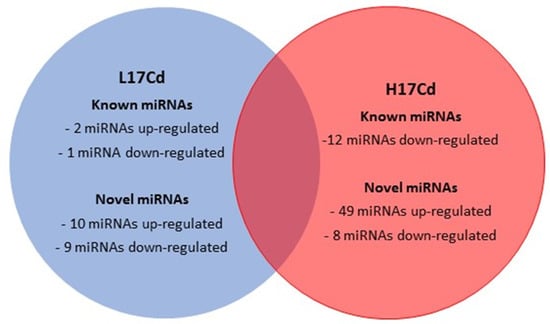 In a study conducted by Qiu et al. [56], Real-Time PCR was utilized to obtain the expression profiles of T. aestivum microRNA. The webtool, psRNATarget, was employed to recognize the miRNA targets (mRNA). Qiu et al. [56] recorded different miRNA expression profiles under Cd stress, in the roots and shoots of T. aestivum seedlings. Physiological variations, such as reduction in shoot and root elongation, were observed between the control seedling and the Cd treated seedlings. The relative water content of the leaves of the Cd treated seedlings was reduced (67%) when compared to the control seedlings (94–96%) after 48 h of exposure to Cd. The chlorophyll content of the treated seedlings was reduced, and the lipid peroxidation of the membranes was increased under Cd stress [53]. Figure 2 exemplifies the five miRNAs differentially expressed between the roots and shoots of Cd treated seedings [56]. miR398 was observed to target CSD, a Cu/Zn Superoxide Dismutase (a ROS scavenger). A reduction in miR398 expression led to an increase in CSD expression [56]. However, this decreased expression in miR398 indirectly led to the increase in hydrogen peroxide production (correlates to the increase in lipid peroxidation) due to the role of CSD in the dismutation of superoxide radicals to produce more hydrogen peroxide [57]. Thus, miR398 was deemed a main constituent for the detoxification of ROS, by the control of the target gene, CDS [56]. To conclude, Qiu et al. [56] suggested wheat miRNAs are involved in the facilitation of Cd stress signaling responses and, furthermore, suggested that the differential expression patterns of miRNA observed in T. aestivum roots and leaves suggest that there are variations in the functional roles of miRNA in particular organs of T. aestivum plants with regard to the regulation of plant tolerance [53]. Another study by Zhou et al. [58] took a different approach in which they focused on the regulatory mechanisms between heavy metal ATPases (HMAs) and microRNAs in T. aestivum plants. The aim was to comprehend the global transcriptional response of T. aestivum plants to Cd stress and how this response was controlled by miRNAs. Two wheat cultivars (low-Cd accumulation (L17) and High-Cd accumulation (H17)) were analyzed using next generation transcriptomic and miRNA sequencing to the miRNA profiles of each cultivar in response to Cd stress. qRT-PCR was employed to obtain and observe the differentially expressed miRNA profiles and the TaHMA profiles in the root sections [58]. Figure 3 exemplifies the differential expression between the two Cd treated cultivars. The results obtained in this study noted two particular miRNAs (miR9664-3p and tea-miR159a) which were upregulated in L17Cd (Cd treated), compared to its control L17CK, but downregulated in H17Cd [58]. Further analysis demonstrated that the putative targets of both miR9664-3p and tea-miR159a were downregulated in L17Cd plants. Han et al. [59] previously recorded that tea-miR159a expression in leaf and developing seeds of wheat plants play a positive role in the response to Puccinia striiformis, through the regulation of TaMyb3 expression [59,60]. Zhou et al. [58] also identified 32 TaHMA genes in T. aestivum plants. Zhou et al. [58] deduced that miRNA can regulate TaHMAs; however, further validation was required for future works. Concluding, both studies [56,58] depict miRNAs as potentially playing an essential role in Cd responses in T. aestivum plants, either through the regulation of the miRNAs responsible in ROS scavengers or in the regulation of the TaHMA2;1 gene.