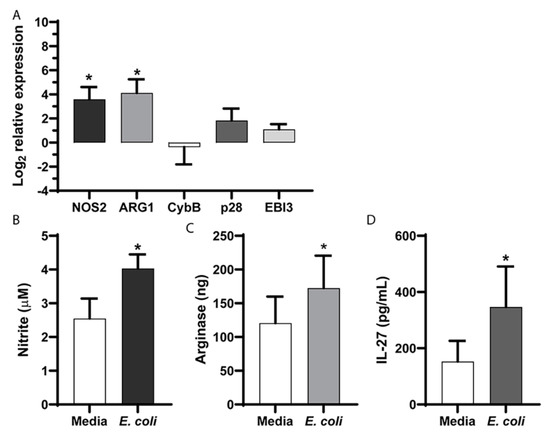 To determine if changes in MDSC effector functions resulted from a direct exposure to bacteria or other signals in the host during an infection, MDSCs were cultured with E. coli in vitro. MDSCs were isolated from naïve control pups using an immunomagnetic separation, cultured with E. coli for 30 min prior to treatment with gentamicin and then incubated for an additional 18–20 h. A gene expression analysis demonstrated findings similar to those observed in MDSCs from infected neonatal pups. The NOS2 and ARG1 gene expressions were significantly increased following an exposure to bacteria (Figure 2A). Although the increase in the p28 gene expression did not achieve a statistical significance, the pattern of change was similar to that observed in MDSCs from infected pups relative to the controls (Figure 2A). Changes in the gene expression were further confirmed at the level of the protein expression or enzymatic activity. Functional assays demonstrated increased NO production, Arg-1 activity and IL-27 secretion in vitro following a culture with E. coli (Figure 2B–D). These findings suggest that MDSC interactions with bacteria alone were sufficient to drive a change in the effector function that was regulated at the gene expression level.
