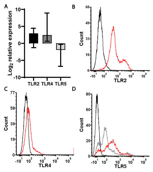 MDSCs were isolated as described above and seeded at 3–5 × 105 per well in a 96-well cell culture plate (Corning, Corning, NY, USA). The cells were subsequently treated in the presence or absence of TLR2, TLR4, (Miltenyi, Bergisch, Germany) or TLR5 (Invivogen, San Diego, CA, USA) neutralizing antibody (0.3–0.5 µg per 3–5 × 105 cells) for 45 min and incubated at 37 °C with 5% CO2 for 18–20 h. After the neutralization, MDSCs were stimulated with E. coli at an MOI of 10 for 30 min before treatment with 100 µg/mL of gentamicin. The cells were harvested with TriReagent (MilliporeSigma, Burlington, MA, USA) for the RNA isolation and the gene expression analysis.