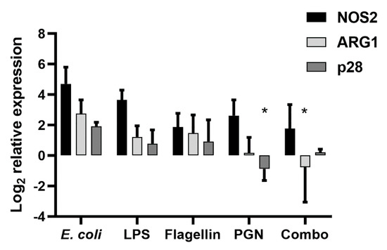 Bacterial components elicit a variable stimulation of the effector gene expression compared with E. coli. MDSCs were isolated from the spleens of neonatal control mice by an immunomagnetic selection and cultured with E. coli at a target MOI of 10 for 30 min prior to the addition of gentamicin (100 µg/mL) or stimulated with lipopolysaccharide (LPS) (1 µg/mL), flagellin (100 ng/mL), peptidoglycan (PGN) (10 µg/mL), or a cocktail of each component at the described concentrations (combo). RNA was isolated 18–24 h post-infection or stimulation and the expression of NOS2, Arg-1 and IL-27p28 genes was measured by quantitative real time PCR. The values were normalized to β-actin and expressed as a log2 change relative to the uninfected controls using the formula 2−ΔΔCt. The mean expression ± standard error from seven experiments for individual bacterial components and three experiments for the combination of components are shown. An asterisk indicates a statistical significance in the 95% confidence interval that was determined using a two-way mixed model analysis of variance. Asterisks indicate a statistically significant difference in the expression between individual or the combination of components compared with E. coli within a gene.