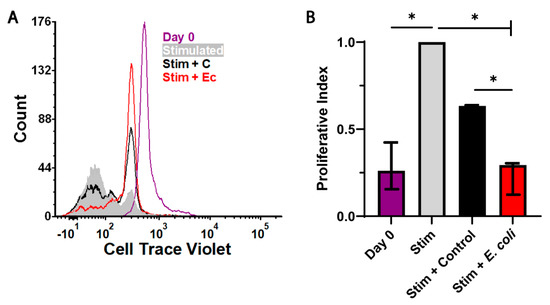 MDSCs are defined by their ability to limit T cell proliferation specifically via the NOS2 expression and by starving proliferative T cells of available arginine [20,21]. NOS2 is able to oxidize arginine, contributing to a depletion in the environment as well as inhibiting JAK3/STAT5 signaling required for IL-2 receptor upregulation [21]. Similarly, IL-27 has been shown to promote immunosuppressive activity from T cells [22]. Thus, we hypothesized that the observed increase of the effector functions during an infection would translate to an enhanced ability to restrict T cell proliferation by MDSCs from infected neonates. To test this hypothesis, MDSCs were isolated from the spleens of uninfected control and E. coli-infected neonatal pups using an immunomagnetic separation. CD4+ T cells were isolated from adult mouse spleens to eliminate the possibility of limitations in the T cell responsiveness associated with neonates, labeled with Cell Trace Violet and expanded by the stimulation of CD3 and CD28 alone or during co-culture at a 1:1 ratio with control or infected MDSCs for four days. An analysis by flow cytometry demonstrated that MDSCs from infected neonates were able to suppress T cell proliferation to a greater level compared with uninfected counterparts (Figure 5). The T cell proliferation reduced by 40% in the presence of control neonatal MDSCs was further reduced by approximately 75% in the presence of MDSCs derived from septic neonates (Figure 5B). This demonstrated that the changes in MDSC activity during the infection and in response to E. coli manifested as a heightened level of suppressive activity.