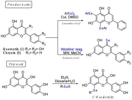 A different seleno-functionalization was proposed by Antunes et al. with the treatment of either quercetin or chrysin derivatives with Woollins’ reagent under microwave irradiation, and the consequent introduction of a selone functionality at the C-4 position. Moreover, in this case the introduction of a selenium atom in the flavonol scaffold resulted in increased radical scavenging and anticancer activities, the latter demonstrated in a panel of different cancer cell lines [20].