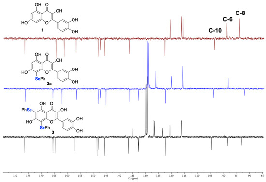 The structure of 2a was assigned comparing the 13C NMR spectra of compounds 1, 2a, and 3 acquired using a standard APT sequence (attached proton test; Figure 2). Starting from the selected 13C NMR resonances unambiguously assigned in the literature [23] (spectrum in red color), the analysis clearly indicates that in 2a C-8 is a quaternary carbon (spectrum in blue color) and that in 3 both C-6 and C-8 are quaternary (spectrum in black color).
