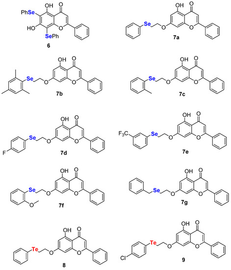 Solvents and reagents were used as received unless otherwise noted. The starting materials are commercially available; diselenides 4b–f [25,26] and chrysin derivatives 6, 7a–g, 8, and 9 belong to the same batch described in ref. [27] and were synthesized as reported in the literature; the physical and spectral data of 6, 7a–g, 8, and 9 are reported below. Reactions were conducted in round-bottom flasks and were stirred with Teflon-coated magnetic stirring bars.