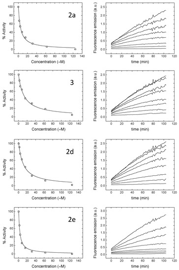 where Ki is the intrinsic (i.e., substrate concentration-independent) inhibition constant, Km is the Michaelis–Menten constant for the enzyme–substrate interaction, and [S] is the substrate concentration. Because Km and [S] are known, the intrinsic inhibition constant can be determined. Furthermore, approximating the free compound concentration by the total compound concentration and neglecting ligand depletion, the Kiapp in Equation (2) is equivalent to the IC50, as reported in Table 3. However, it should be emphasized that the IC50 is an assay-dependent inhibition potency index (among other parameters, it depends on the enzyme and substrate concentrations, as well as on the Km); thus, the intrinsic inhibition constant is a better inhibition potency index. Uncertainties have been reported as 95% profile likelihood asymmetric confidence intervals, as especially recommended for equilibrium constants (i.e., binding association/dissociation constants and inhibition constants) [32].