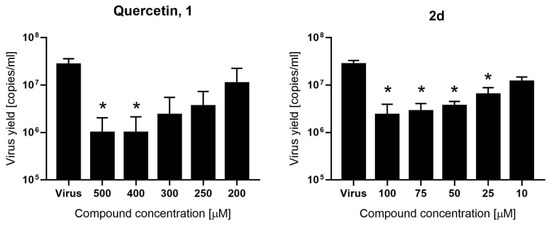 Inhibition of SARS-CoV-2 replication by quercetin (compound 1) and compound 2d. Virus replication was evaluated at the given compound concentrations using RT-qPCR and the data are presented as SARS-CoV-2 RNA copies per mL of the original sample. Bars show mean value ± SEM from three independent experiments. The significance level (* p < 0.05) is denoted with an asterisk in the graph.