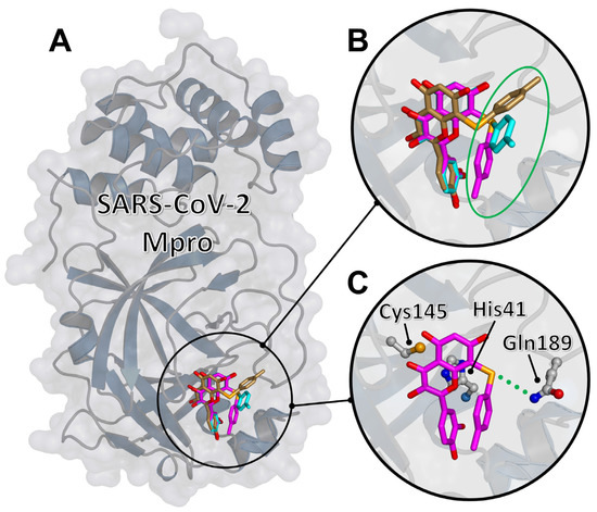 Molecular docking of compound 2d to SARS-CoV-2 Mpro. (A) The best three docking poses bound in the protein active site. (B) Detail of the docking poses highlighting the quercetin scaffold approximately superimposed, while the chemical adduct (circled in green) shows a large variability. (C) The most favorable docking pose (binding energy −8.2 kcal/mol), with the side chains of selected protein residues (the catalytic dyad His41/Cys145 and the hydrogen bonded residue Gln189) explicitly shown.