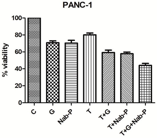 It appears that the triple combinatorial scheme of T + G+ Nab-P provides an extra reduction of cell viability in both cell lines than the agents alone (Figure 1).