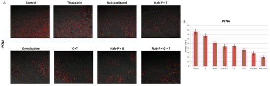 Tinzaparin leads to reduced proliferation when used in combination with chemotherapeutic drugs. (A) Immunofluorescence with PCNA antibody to 4 μm paraffin sections. Representative images (PCNA-red spots and tissue-bright field) of each group (control, tinzaparin, nab-paclitaxel, nab-paclitaxel + tinzaparin, gemcitabine, gemcitabine + tinzaparin, nab-paclitaxel + gemcitabine, nab-paclitaxel + gemcitabine + tinzaparin) at 100× magnification, scale bar = 100 μm. (B) Diagram showing the percentage of positive stained cells. n = 10/group. All data represent mean ± SD.