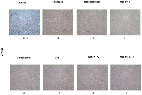 Tinzaparin augments further decrease in neoangiogenesis when added to double or triple combinations. Representative photos of each group (control, tinzaparin, nab-paclitaxel, nab-paclitaxel + tinzaparin, gemcitabine, gemcitabine + tinzaparin, nab-paclitaxel + gemcitabine, nab-paclitaxel + gemcitabine + tinzaparin) after staining with anti-VEGFR2 at paraffin sections. Symbols are denoted as: + low expression, ++ mid expression, +++ high expression, ++++ abundant expression. n = 5/group, 200× magnification, scale bar = 50 μm.