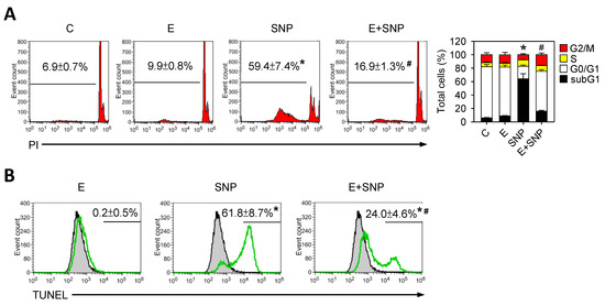 The effect of SNP and/or S-Equol on cell cycle progression and apoptosis of primary chondrocytes. After cells were treated with S-Equol for 24 h in the presence or absence of SNP for another 24 h, (A) the cell cycle distribution was determined by flow cytometry and percentage of the subG1 phase was recognized as apoptotic cells; (B) apoptotic cells were also determined by TUNEL. The gray peak is vehicle control and the percentage of apoptotic cells of treated cells is shown in the figure. The results are expressed as the mean ± S.D. for three separate experiments, each in triplicate. * p < 0.05 compared to the untreated control. # p < 0.05 compared to the SNP treated group.