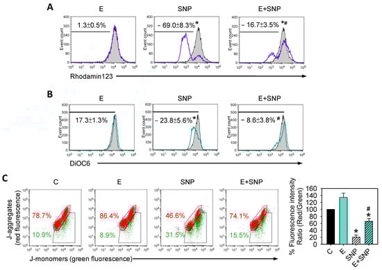 The effect of SNP and/or S-Equol on the mitochondrial membrane potential (ΔΨM) of primary chondrocytes. After cells were treated with S-Equol for 24 h in the presence or absence of SNP for another 24 h, ΔΨM was determined by (A) Rhodamin123, (B) DiOC6, or (C) JC-1 staining, respectively, followed by flow cytometry. The gray filled area is the untreated control, and those delimited by the purple or green lines are the treated groups. In non-damaged cells with high ΔΨM, JC-1 spontaneously forms complexes known as J-aggregates (red fluorescence), whereas in unhealthy cells with low ΔΨM, JC-1 remains in the monomeric form (green fluorescence). The results are expressed as the mean ± S.D. for three separate experiments. * p < 0.05 compared to the untreated control. # p < 0.05 compared to the corresponding SNP-treated group.