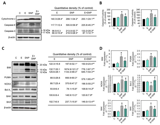 The above pro-apoptotic and anti-apoptotic members were analyzed after SNP and/or S-Equol treatment for 24 h. Clearly, cytochrome c levels, and caspase-9 or caspase-3 levels and activities were increased by SNP and these increases were weakened by S-Equol addition (Figure 4A,B). Those were consistent with apoptosis (Figure 2) and mitochondrial membrane potential (Figure 3) results. Furthermore, SNP increased the gene and protein expression of pro-apoptotic BIM, PUMA, NOXA, BAX, BAK, and decreased anti-apoptotic proteins expressions of Bcl-XL and Bcl-2 (Figure 4C,D). Similar to the above findings, S-Equol addition could lessen all the SNP-caused effects.