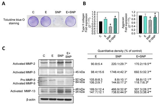 The effect of SNP and/or S-Equol on extracellular matrix and MMPs expression of primary chondrocytes. After cells were treated with S-Equol for 24 h in the presence or absence of SNP for another 24 h, (A) glycosaminoglycan (GAG) contents were determined by toluidine blue O staining followed by colorimetric assay; (B) mRNA levels of type II collagen and aggrecan were measured by real-time PCR and β-actin was used as the internal control. The data are expressed as fold changes compared to those in untreated control; (C) MMP-2, MMP-3, MMP-9, and MMP-13 protein levels were measured by Western blotting and β-actin was used as the internal control. The data of the right panel are expressed as the relative density compared to that in untreated cells (control), which was 100%. The results are the mean ± S.D. for three separate experiments. * p < 0.05 compared to the corresponding untreated control. # p < 0.05 compared to the corresponding SNP treated group.