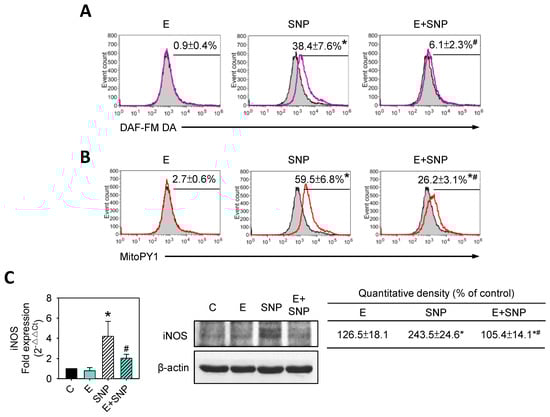 The effect of SNP and/or S-Equol on nitric oxide (NO) and hydrogen peroxide (H2O2) production of primary chondrocytes. After cells were treated with S-Equol for 24 h in the presence or absence of SNP for another 24 h, (A) NO or (B) H2O2 production was determined by DAF-FM DA or MitoPY1 staining, respectively, followed by flow cytometry. The gray filled area is the untreated control, and those delimited by the purple or red lines are the treated groups. (C) iNOS mRNA (left side) and protein (right side) levels were measured by real-time PCR and Western blotting. β-actin was used as the internal control. The data are expressed as fold changes compared to that in untreated control. The results are expressed as the mean ± S.D. for three separate experiments. * p < 0.05 compared to the untreated control. # p < 0.05 compared to the corresponding SNP treated group.