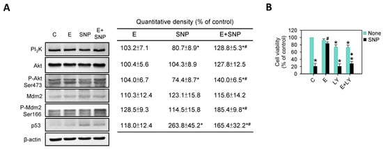 The effects of SNP and/or S-Equol on PI3K-Akt pathway of primary chondrocytes. The cells were treated with S-Equol for 24 h in the presence or absence of SNP for another 24 h, and then (A) PI3K, Akt, P-Akt, Mdm2, P-Mdm2, and p53 protein levels were measured by Western blotting and β-actin was used as the internal control. The data in the right panel are expressed as the relative density compared to the untreated cells (control), which was 100%. (B) The cells were pretreated with the 10 μM PI3K inhibitor, LY294002 (LY), for 1 h and then treated with 0.8 mM SNP and/or 30 μM S-Equol for a further 24 h and, subsequently, cell viability was measured using trypan blue exclusion. The data are expressed as a percentage of the control group. The results are the mean ± S.D. for three separate experiments. * p < 0.05 compared to the corresponding untreated control. # p < 0.05 compared to the corresponding SNP treated group. ◆ p < 0.05 compared to the corresponding S-Equol combined with SNP treated group.